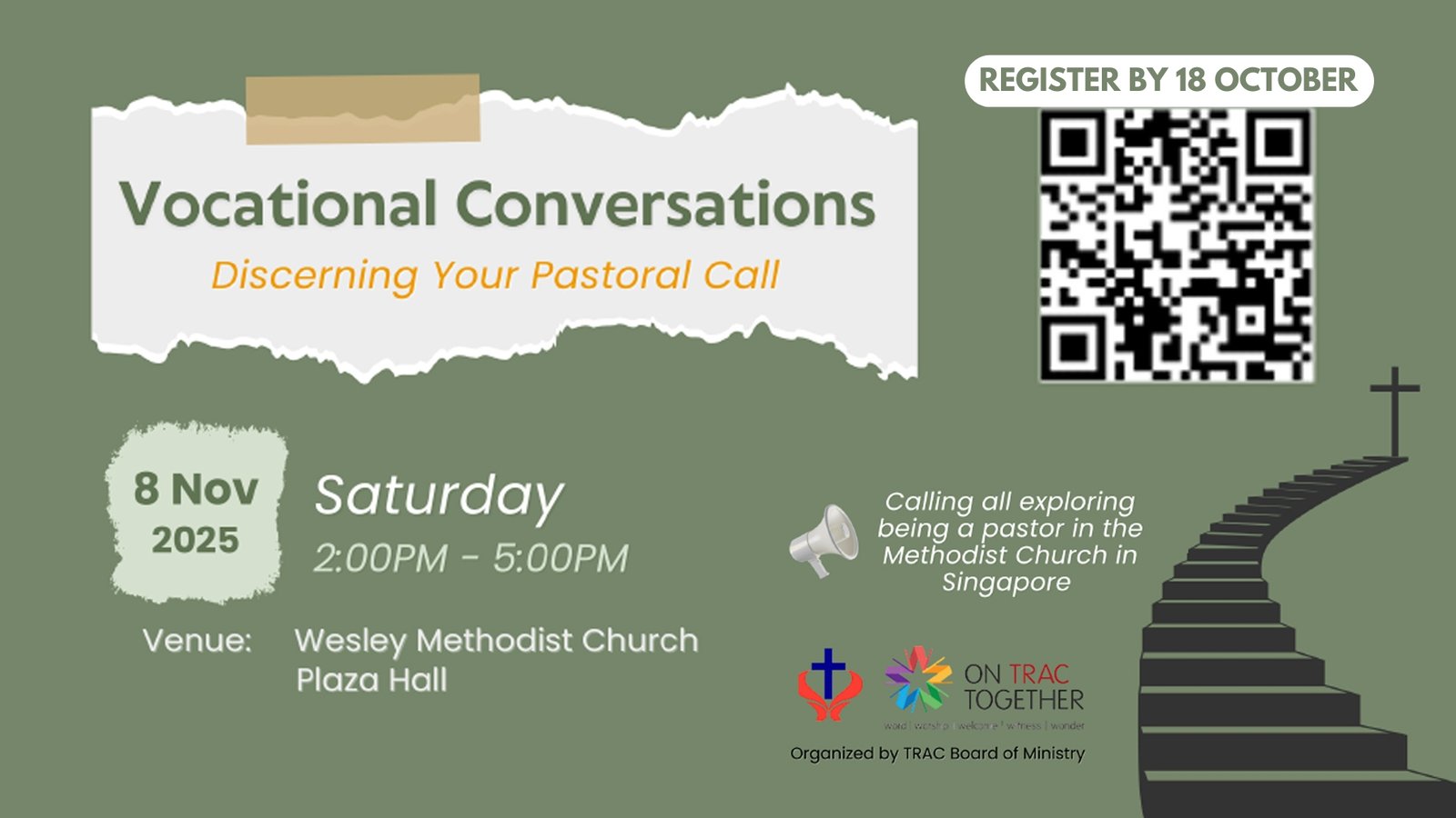 Do you feel God calling or nudging you towards being a pastor in His service? There is a deep joy being in the frontlines of seeing how God works mightily in the lives of others, and that’s the joy that pastors get! Find out more about being a pastor of the Methodist Church in Singapore at the Trinity Annual Conference Vocational Conversations 2025. Scan this QR code to sign up now.