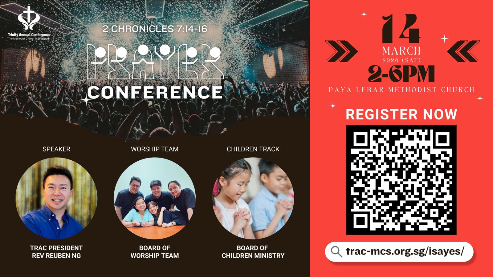 The 21 Trinity Annual Conference (TRAC) churches will come together to worship and pray at TRAC “I Say Yes” Prayer Conference 2026. This will be an amazing session where we all come before God and surrender ourselves to Him, allowing His presence to wash over us. Even the young ones can Say Yes because there is a Children’s Ministry for those aged 7 to 12 years old.