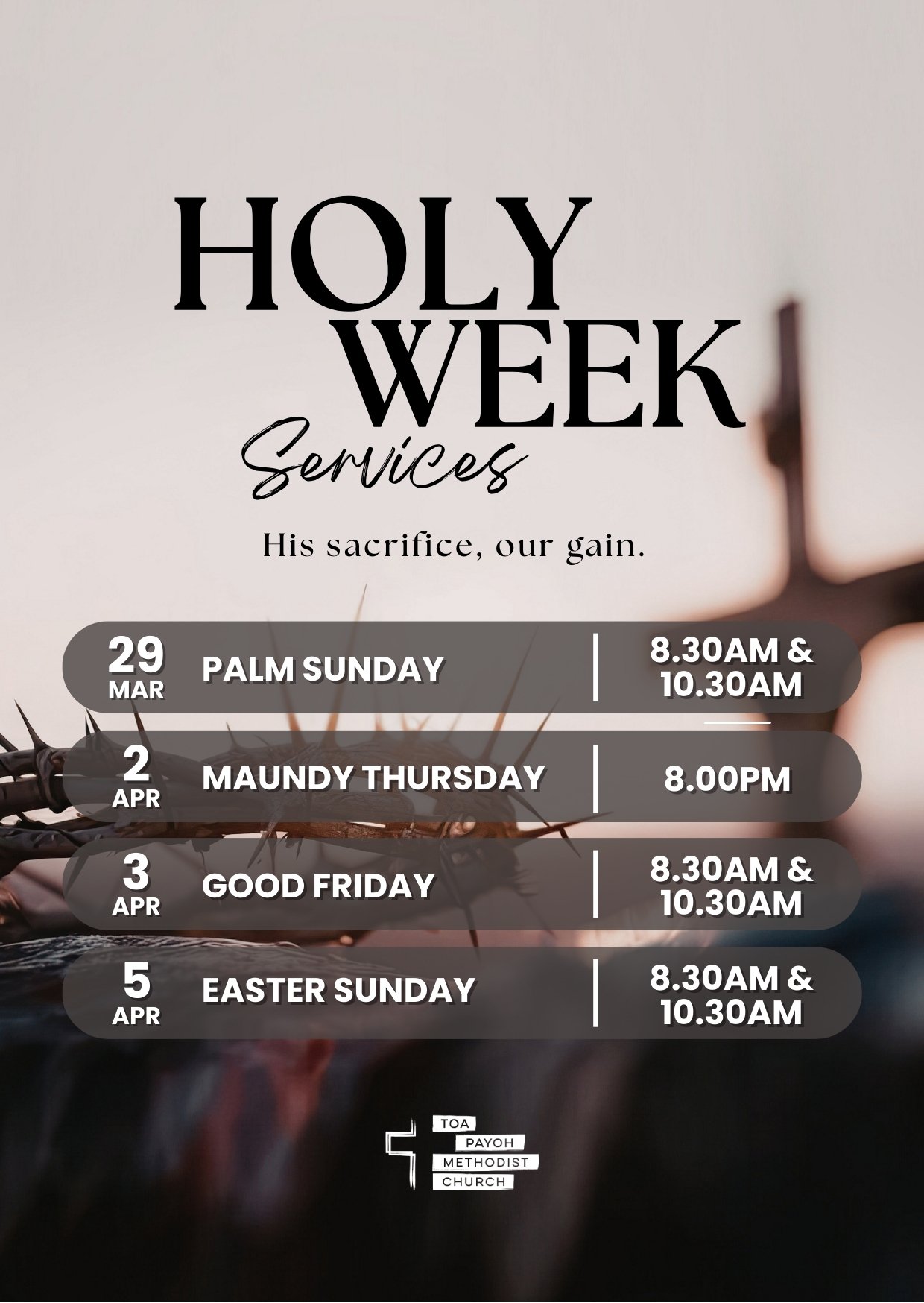Holy Week is the time we remember the pain, love and sacrifice of this man Jesus. He forsook the pleasures of Heaven to come as a man and be crucified for us, so that we will not have to pay the painful price for all our sins. By His sacrifice, and His resurrection, we are saved and have eternal life.